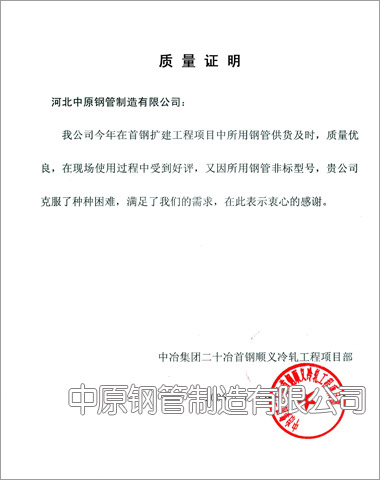 中冶集團二十冶首鋼順義冷軋工程項目部業(yè)績證明